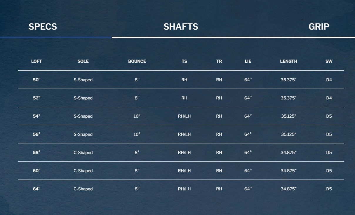 Gap and Sand Wedge lofts feature S-Shaped sole grinds, while Lob Wedge lofts use a C-Shaped grind, giving players an ideal level of versatility in every loft.